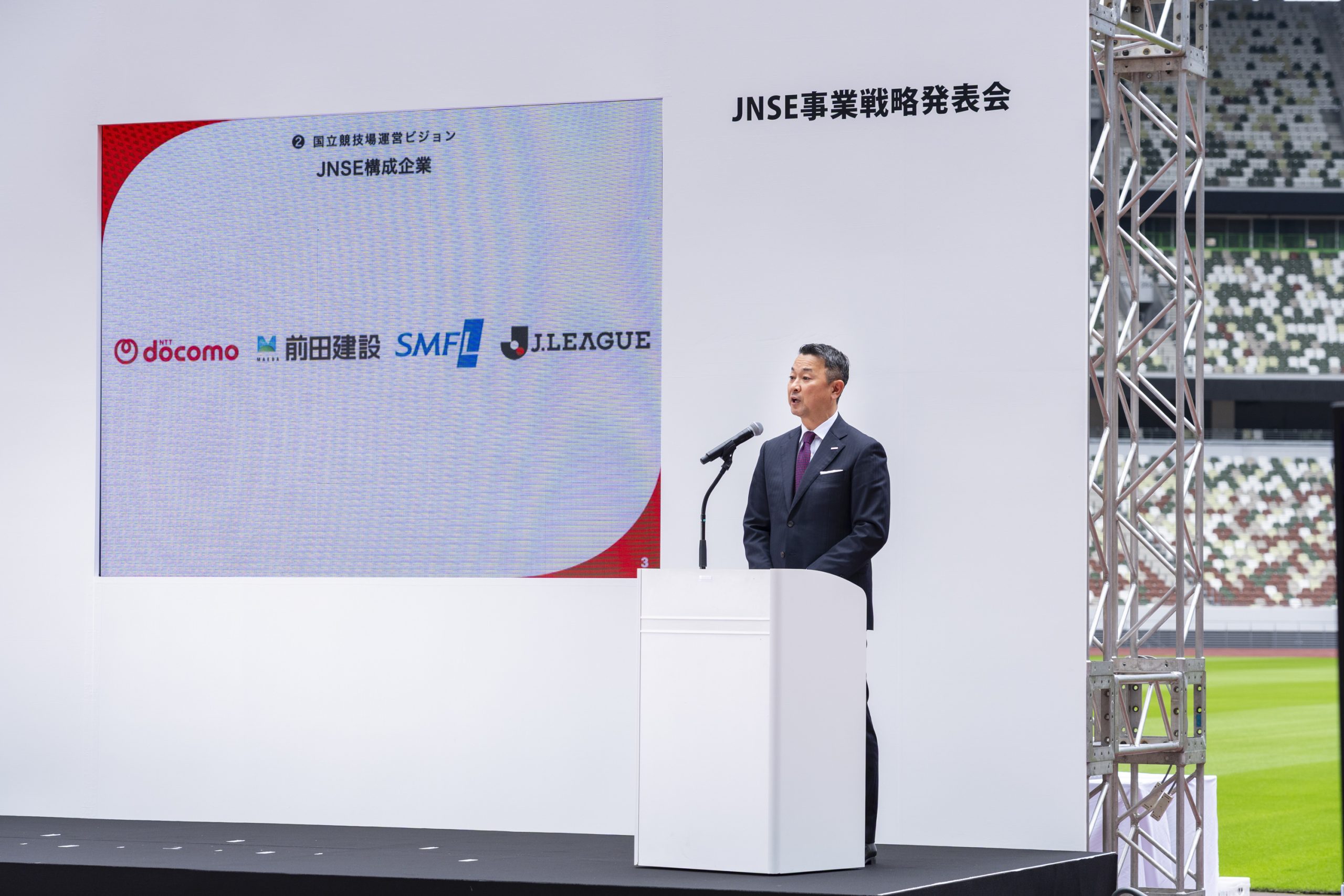 事業戦略発表会を開催したJNSEは、2025年4月から国立競技場の運営に携わっている新会社だ。NTTドコモ、前田建設工業、SMFL みらいパートナーズ、日本プロサッカーリーグの4者の出資によって設立され、民間企業の視点やノウハウを取り入れることで、スタジアムの運営効率化と新たな事業モデルの確立を図っている。