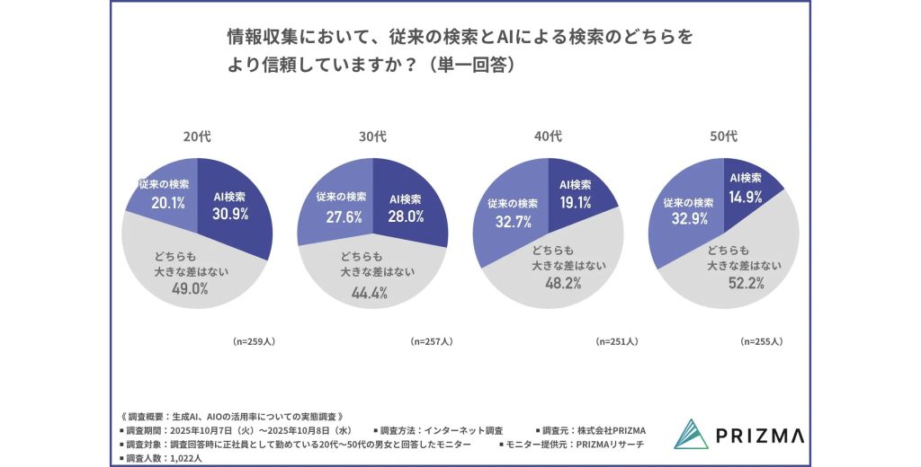 この傾向は、40代や50代においても同様であり、どの年代でもAI検索を一定程度信頼できる手段とみなしている層が多数派となっている。