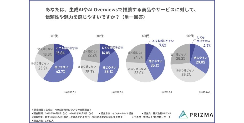 さらに、生成AIやAI Overviewsが推薦する商品やサービスに対して、信頼性や魅力を感じやすいかどうか聞いたところ、「とても感じやすい」「感じやすい」が20代~30代では半数以上、40代は約4割、50代では約3割となった。