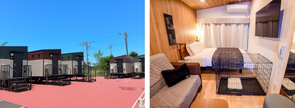 今回同社は、新たな宿泊需要を創出するため、愛犬と一緒に泊まれる1棟独立型のコンテナ型客室「コテージルーム」5室を新設。