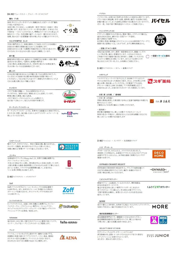 施設内には、アパレルやアミューズメント、サービス、飲食店、クリニックなど、計40店舗が出店。地下1階、1階には飲食店やカフェ、ギフトコーナー、名鉄一宮駅および駐車場直結の4階には、食料品スーパーが出店するという