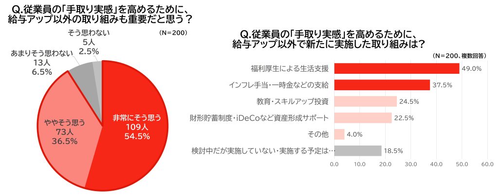 従業員の手取り実感を高めるために給与アップ以外の取り組みも重要だと思うか、具体的な取り組み