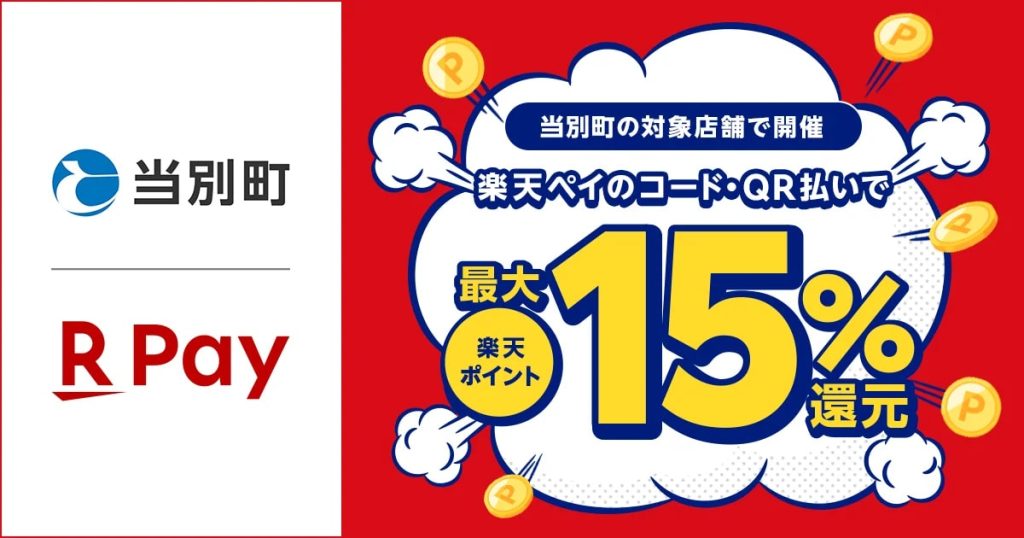 また、「楽天ペイ」アプリでは、対象店舗で「楽天ポイントカード」を提示し、「楽天キャッシュ」を支払い元としてコード決済を行うと、最大2.5%のポイント還元が受けられる仕組みを導入している。このため、当別町のキャンペーンと併用することで、合計最大17.5%分のポイント還元が可能となる。