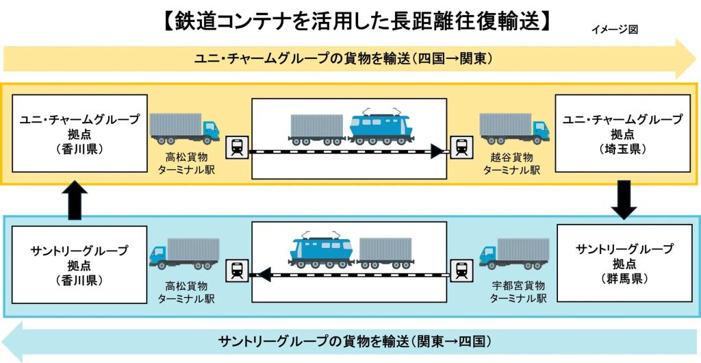 同取り組みでは、これまでそれぞれトラックで片道運行されていた輸送を鉄道コンテナ輸送へ切り替え、往路(四国から関東)は、ユニ・チャームグループの衛生用品を、復路(関東から四国)は、サントリーの酒類・清涼飲料製品を輸送するという。