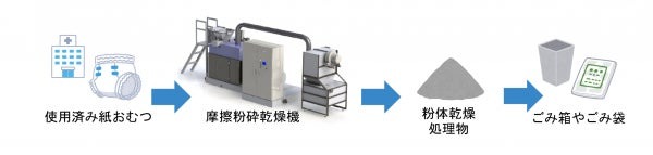 同実証では、使用済み紙おむつを粉砕し、その際に発生する摩擦熱で乾燥させる摩擦粉砕乾燥機の安定性・操作性を向上させるとともに、使用済み紙おむつ由来の臭いを消臭する技術の有効性を確認。