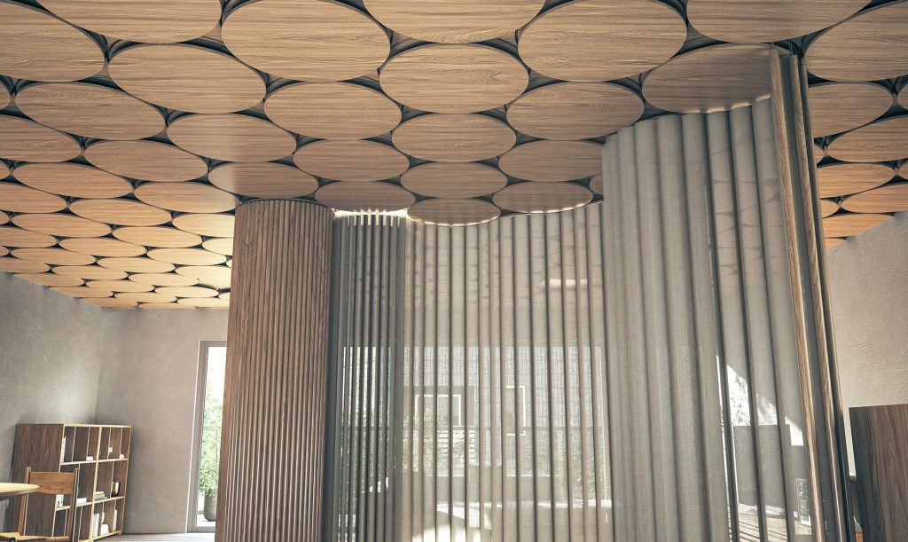 同プロダクトは、従来のLDK(リビング・ダイニング・キッチン)モデルに縛られない住まいを実現する目的で制作。天井に設置された円形レールに沿って自由に移動・配置できる可動式の壁で、空間を仕切ったり、つなげたりと、暮らしの変化に応じて間取りを柔軟に変えることが可能だという。