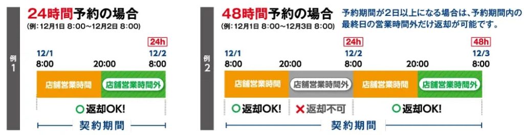 同サービスでは、予約時に「返却時間」の項目で営業時間外の項目を選択すると、閉店から翌朝の営業開始時刻までの間、好きな時間に返却が可能だという。なお、予約期間が2日以上の場合は、予約期間内の最終日の営業時間外にのみ返却が可能となっている。
