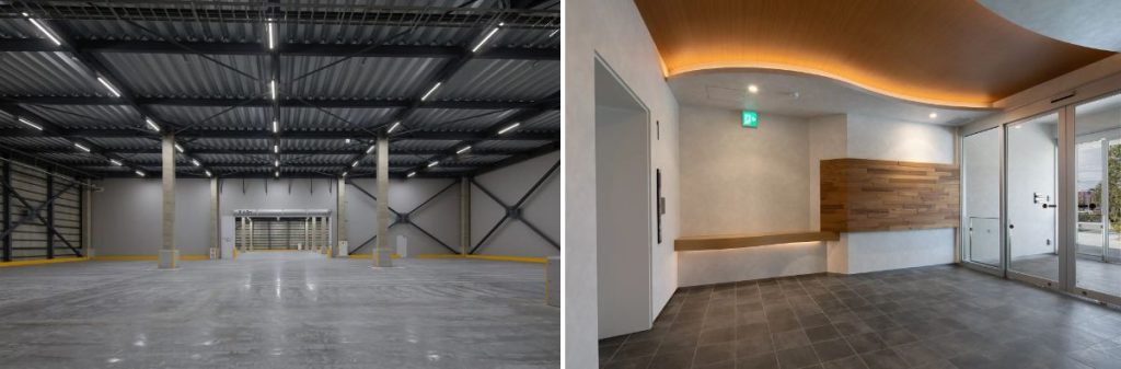 倉庫スペックは、床荷重1.5トン/平方メートル、梁下天井高5.5メートル(最上階は6.5メートル)、柱スパン10メートル以上とし、垂直搬送機・荷物用エレベーターを各2基設置。ニーズに応じたサイズでの貸し出しも可能とされ、小売や食品業界、半導体関連企業の物流拠点としても対応可能としている。