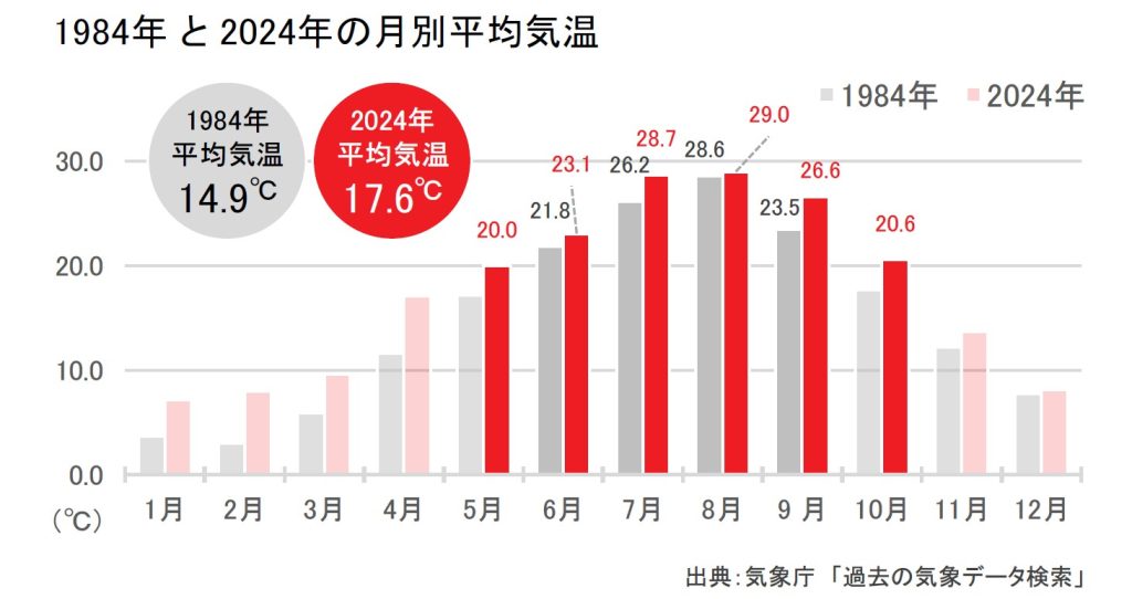 ユニクロ1号店ができた1984年と昨年2024年の東京都の月別平均気温を比較すると、1984年は20°Cを超えた月は6月から9月の4カ月であるのに対し、2024年は5月から10月の6カ月と長くなり、年平均気温は1984年14.9°Cから2024年17.6°Cと、この40年で2.7°Cも高くなった。