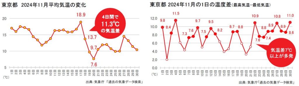 さらに、1日の最高気温と最低気温の温度差が7°C以上あると寒暖差疲労が起こりやすくなると言われているが、それに該当する日は11月の30日間中、20日間となり、体感だけでなく気温も実際に変動の幅が大きくなっている。