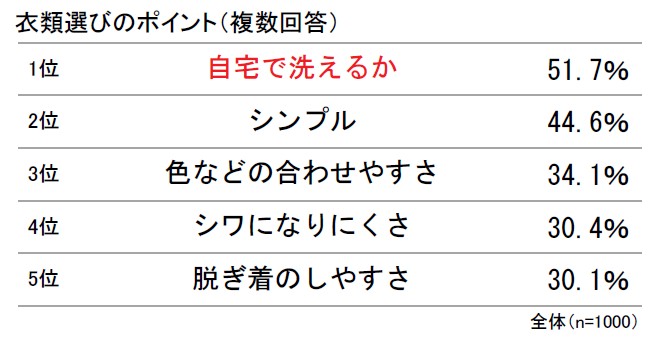 その結果、「自宅で洗えるか」(51.7%)がトップとなり、次いで「シンプル」(44.6%)、「色などの合わせやすさ」(34.1%)、「シワになりにくさ」(30.4%)、「脱ぎ着のしやすさ」(30.1%)が上位に挙げられた。