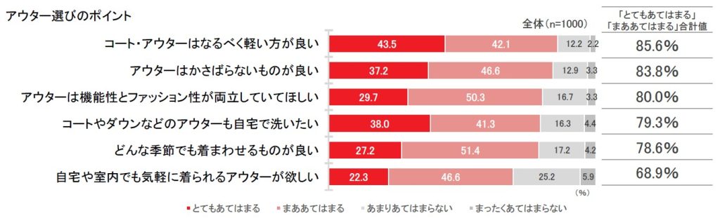 アウター選びに対する考え方を聞くと、「コート・アウターはなるべく軽い方が良い」(85.6%)、「アウターはかさばらないものが良い」(83.8%)、「アウターは機能性とファッション性が両立していてほしい」(80.0%)、「コートやダウンなどのアウターも自宅で洗いたい」(79.3%)といった意見が多く、アウターは軽くて機能的でおしゃれで、かつ自宅で洗えるものが求められていることがわかった。