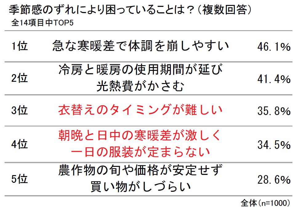 ■“ネオ四季”により「寒暖差による体調不良」や「光熱費高」に加え、「衣類選び」に困る人が多い