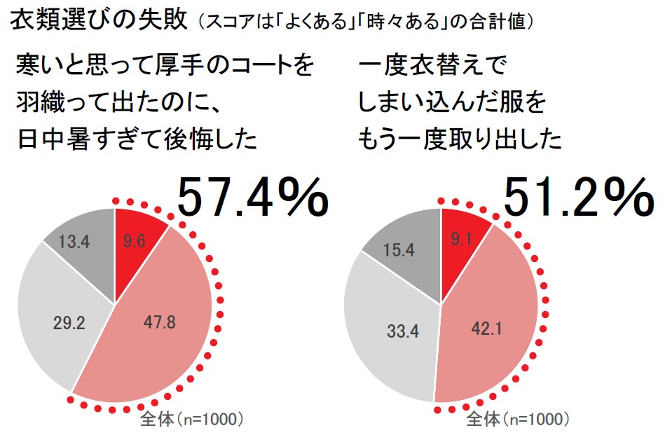 そこで、衣類選びで経験したことを聞くと、6割近くが「寒いと思って厚手のコートを羽織って出たのに、日中暑すぎて後悔した」(57.4%)と答え、約半数が「一度衣替えでしまい込んだ服をもう一度取り出した」(51.2%)と回答。