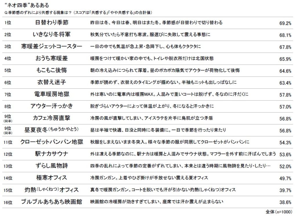 その結果、最も共感度が高かったのは、「昨日は冬、今日は春、明日はまた冬。季節感が日替わりで切り替わる」“日替わり季節”(69.2%)となり、「秋気分でいたら不意打ち寒波。服選びに失敗して震える事態に」“いきなり冬将軍”(68.1%)、「一日の中でも気温が急上昇・急降下し、心も体もクタクタに」“寒暖差ジェットコースター”(67.8%)と続く。