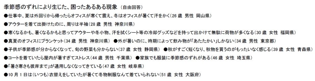 このほかにも、季節感のずれによるあるある現象を募ったところ、「朝・昼・夜、室内・室外で寒さがコロコロ変わり体調が心配」(22歳女性大阪府)、「外が寒くてコートを着ているのに、店は暖房効きすぎて暑い」(25歳男性長野県)など、さまざまな困った現象が寄せられた。