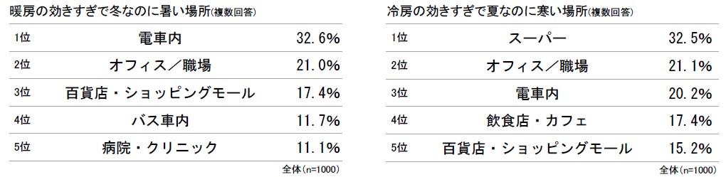 一方、冷房の効きすぎで夏なのに寒くてストレスを感じる場所は「スーパー」(32.5%)、「オフィス/職場」(21.1%)、「電車内」(20.2%)の順に。