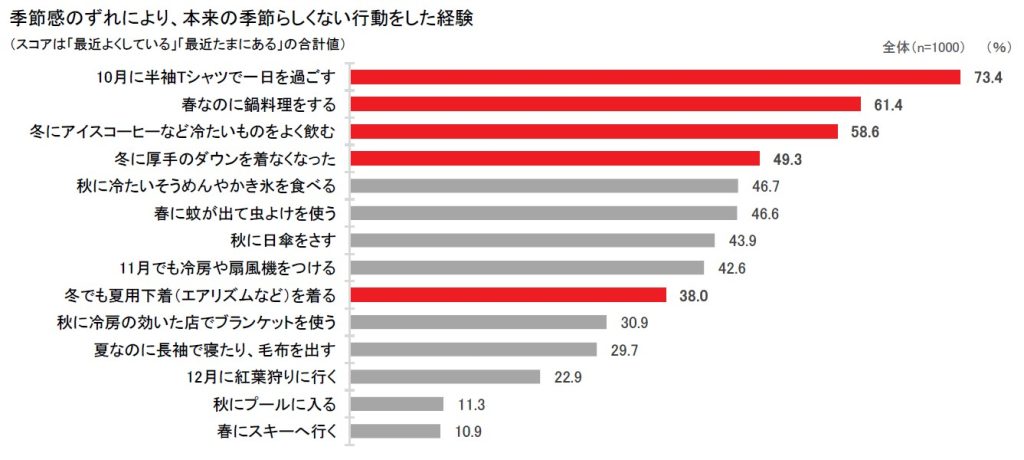季節感のずれにより、本来の季節らしくない行動をした経験を調査したところ、「10月に半袖Tシャツで一日を過ごす」(73.4%)、「春なのに鍋料理をする」(61.4%)、「冬にアイスコーヒーなど冷たいものをよく飲む」(58.6%)、「冬に厚手のダウンを着なくなった」(49.3%)が上位に挙がった。