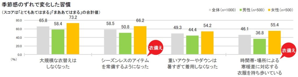 季節感の乱れや気温・気候の変化により以前と変わってきた習慣を聞くと、「大規模な衣替えはしなくなった」(65.8%)、通年素材や通年デザインなどの「シーズンレスのアイテムを常備するようになった」(58.5%)、「時間帯・場所による寒暖差に対応する衣服を持ち歩いている」(46.1%)など、これまでにはなかった衣類習慣が始まっている結果に。