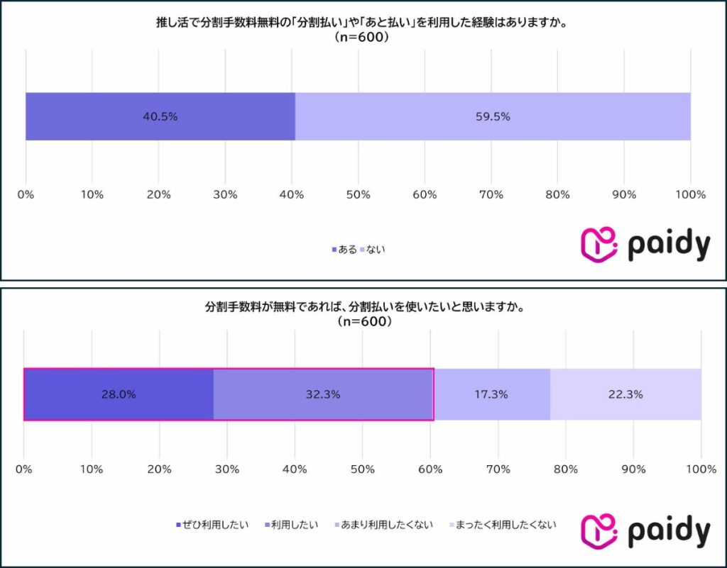 さらに4割以上の人が推し活の買い物において分割手数料無料の「分割払い」や「あと払い」を利用した経験があることも判明。また、全体の6割以上が分割手数料が無料であれば推し活の買い物において分割払いを使いたいと回答していることもわかった。