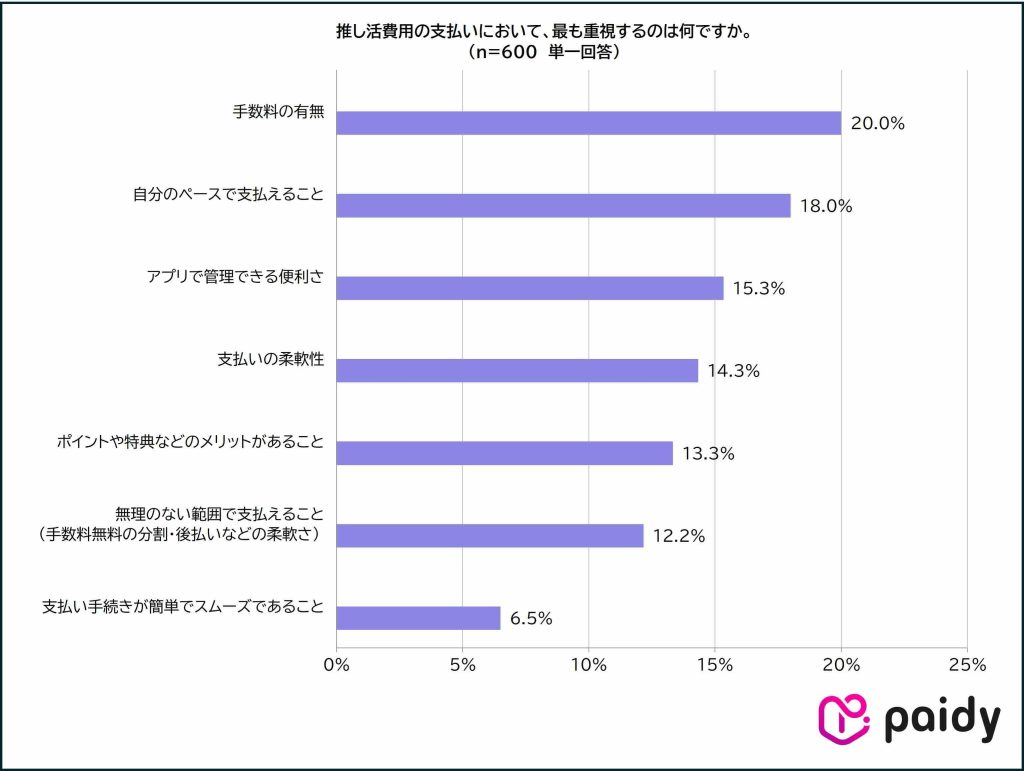 推し活の支払い手段において最も重要視するのは、1位「手数料の有無(20.0%)」、2位「自分のペースで支払えること(18.0%)」、3位「アプリで管理できる便利さ(15.3%)」となっており、推し活において、余計な手数料が不要で、自分らしく使える支払い方法が求められていることがわかった。