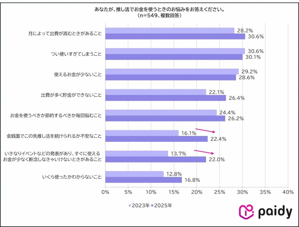 推し活にお金を使っていると回答した人(n=549)を対象に、推し活でお金を使うときの悩みを聞くと、1位「月によって出費が嵩むときがあること(30.6%)」、2位「つい使いすぎてしまうこと(30.1%)」、3位「使えるお金が少ないこと(28.6%)」が挙げられた。