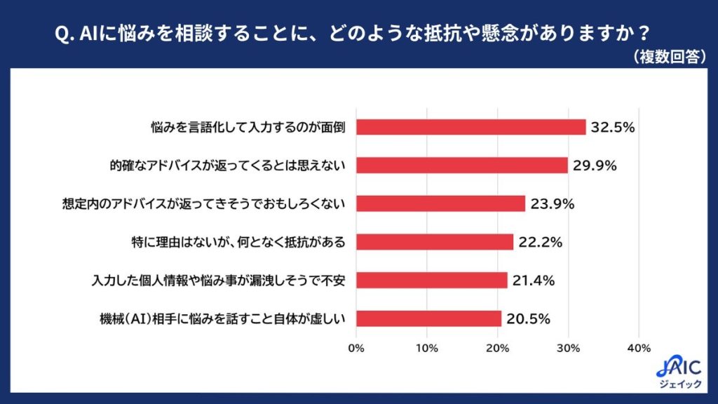あてはまるものをすべて選択してもらったところ、最も多かったのは「悩みを言語化して入力するのが面倒」で32.5%、次いで「的確なアドバイスが返ってくるとは思えない」が29.9%、「想定内のアドバイスが返ってきそうでおもしろくない」が23.9%と続く結果に。