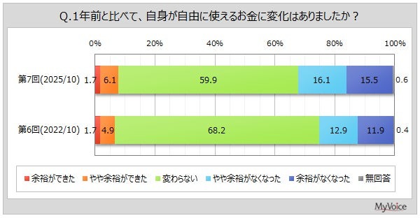 1年前と比べて、自由に使えるお金に余裕ができた人は、「余裕ができた」「やや余裕ができた」を合わせて約8%。余裕がなくなった人(「余裕がなくなった」「やや余裕がなくなった」の合計)は3割強で、2022年調査より増加する結果に。