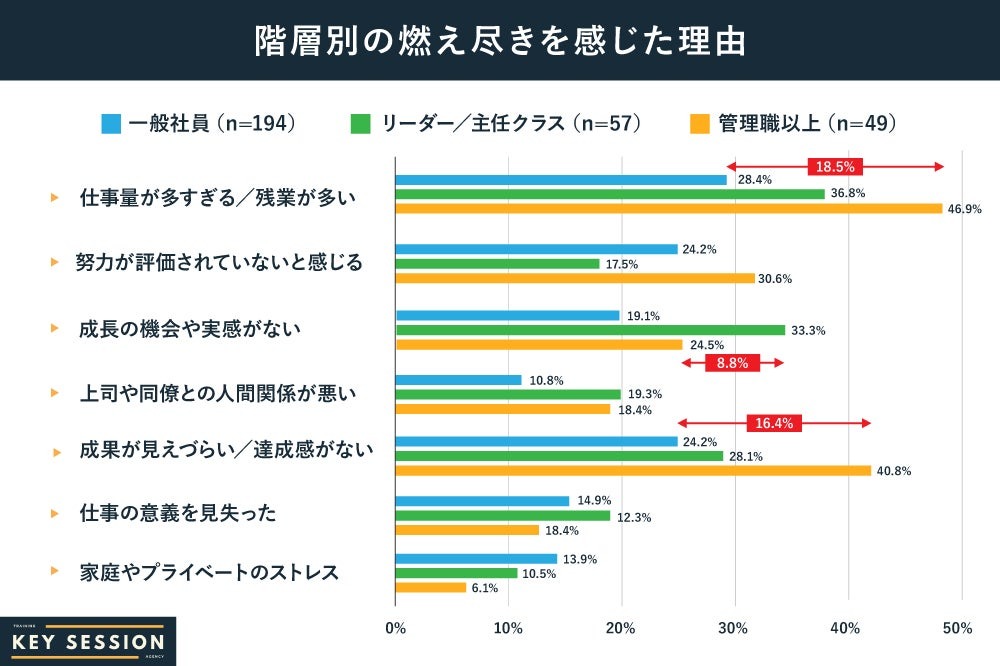 また、階層別に燃え尽きの理由を分析すると、一般社員は「仕事量が多すぎる」が28.4%、「努力が評価されていない」が24.2%、「成果が見えづらい/達成感がない」が24.2%となり、全体と同傾向に。現場社員にとっては「努力の見えづらさ」と「報われなさ」が主なストレスであることがわかる。