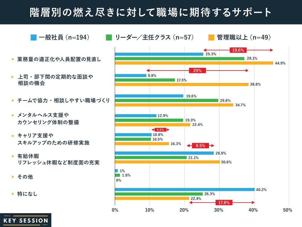 また、「有給・リフレッシュ休暇など制度充実」が13ポイント差で2番目に差異が大きい項目となり、メンタルサポートだけでなく、物理的な休暇への要望も燃え尽き層に強く出ている結果に。