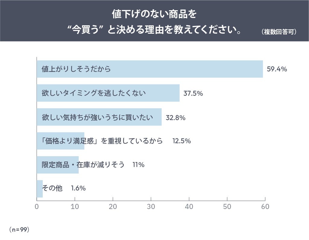 「値下げされない商品を今買う理由」を尋ねたところ、最も多かったのは「値上がりしそうだから」で59.4%という結果に。