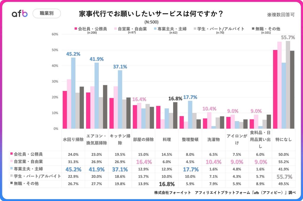 職業別の傾向では、「専業主夫・主婦」が「水回り掃除」「エアコン・換気扇掃除」「キッチン掃除」といった専門性の高い家事を外部に委託したいと考える割合が他職種よりも顕著であった。