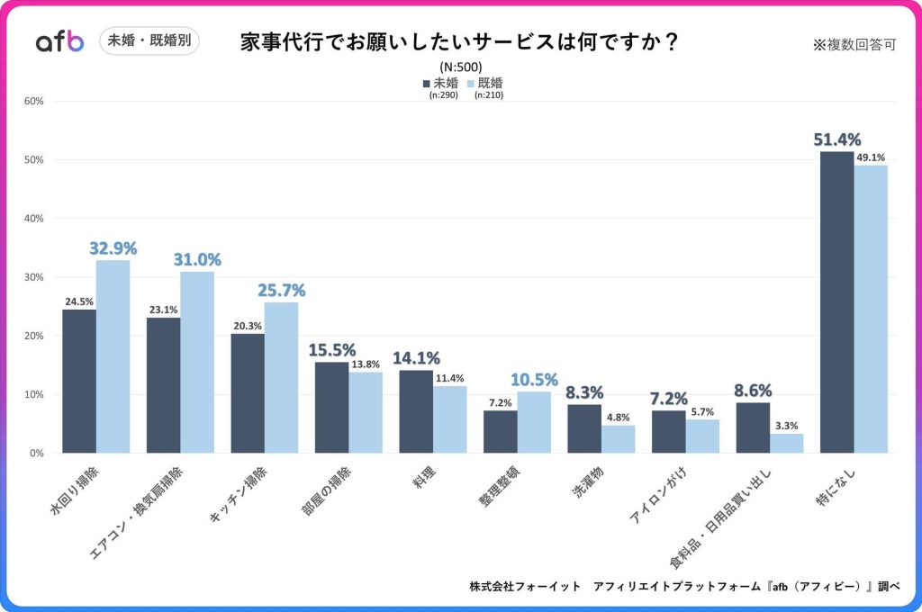 既婚・未婚別にみると、「水回り掃除」「エアコン・換気扇掃除」「キッチン掃除」などの大掃除系サービスは既婚者の回答が多い結果に。一方で未婚者は「食料品・日用品の買い出し」のニーズが高く、忙しい生活の中で発生する日常的なタスクを代行してほしい傾向が見られたという。