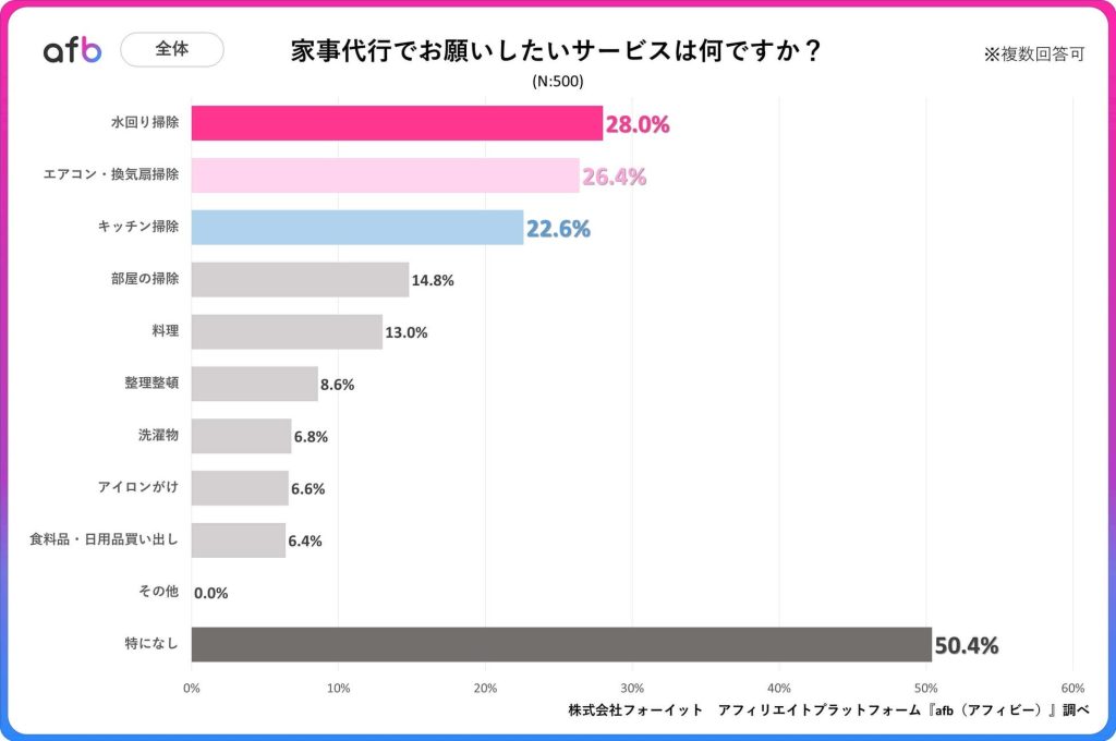 同調査で、家事代行でお願いしたいサービスを聞くと、最も多かったのは「水回り掃除」で28.0%、次いで「エアコン・換気扇掃除」が26.4%、「キッチン掃除」が22.6%と続いた。