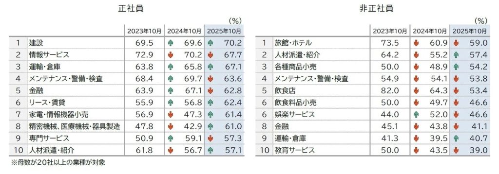 このほか、「運輸・倉庫」(67.1%、同+1.3ポイント)や「メンテナンス・警備・検査」(63.6%、同−6.1ポイント)なども高水準を示し、51業種中8業種で6割を上回った。