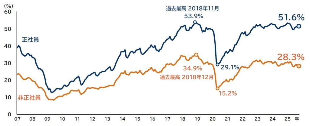 調査の結果、2025年10月時点で「正社員が不足している」と回答した企業は51.6%にのぼり、前年同月(51.7%)から0.1ポイント低下したものの、10月としては4年連続で半数を超えた。依然として高水準での「人手不足」が続いているとのことだ。一方、「非正社員の人手不足」を感じる企業は28.3%で、前年同月から1.2ポイント低下し、10月としては2年連続で3割を下回った。