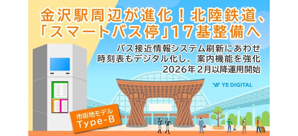 YE DIGITAL(以下、YEデジタル)は、YEデジタルが提供し、ホクリクコムが販売する「スマートバス停」が、北陸鉄道に採用されたと発表した。