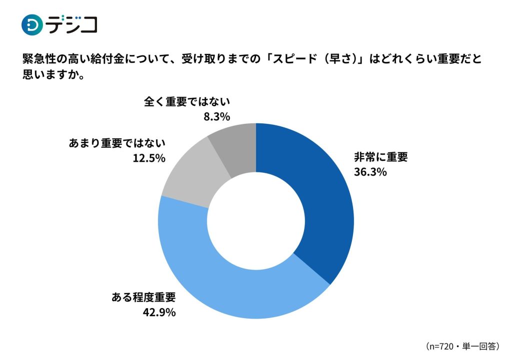 緊急性の高い給付金について、受け取りまでのスピードの重要度について聞いたところ、「非常に重要」(36.3%)と「ある程度重要」(42.9%)を合わせ、約8割(79.2%)の住民が、スピードを重視していると回答。