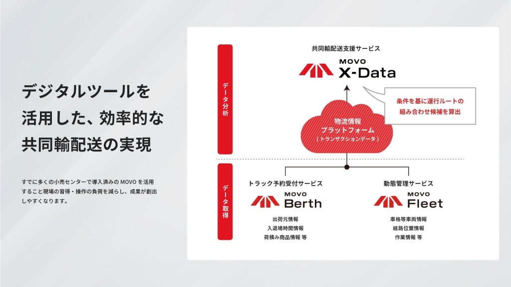 福岡・佐賀に拠点を持つ小売企業6社のデータを基に、500社超の調達先、11カ所の小売物流センター、385店舗以上を対象に実施。同社の「MOVO Berth」「MOVO Fleet」「MOVO X-Data」などのツール群を活用し、拠点間の輸配送を最適化するルートをデジタルで抽出・検討するという。