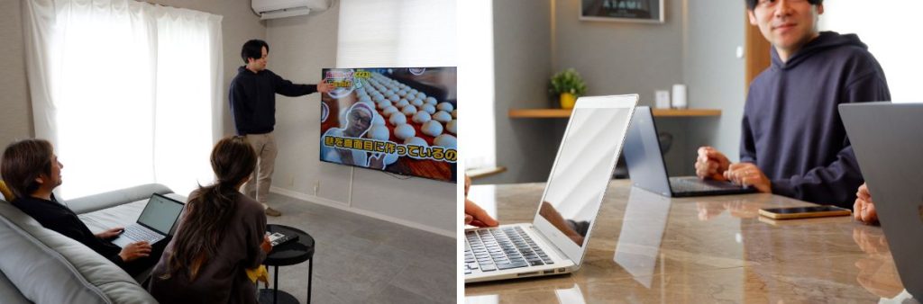 同施設の2階リビングには75インチの大型テレビ、隣接する防音仕様のシアタールームには約100インチ相当のプロジェクター投影を完備しており、大画面でのプレゼン・共有にも最適。