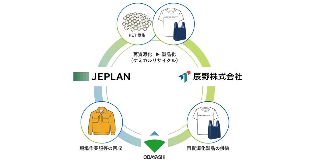 回収した衣類は、JEPLANが処理を行い新たな資源にリサイクルされ、リサイクル資源を活用した布製品を辰野が大林組に供給することにより、建設廃棄物や廃棄物処理時におけるCO2の排出量削減に貢献したとしている。