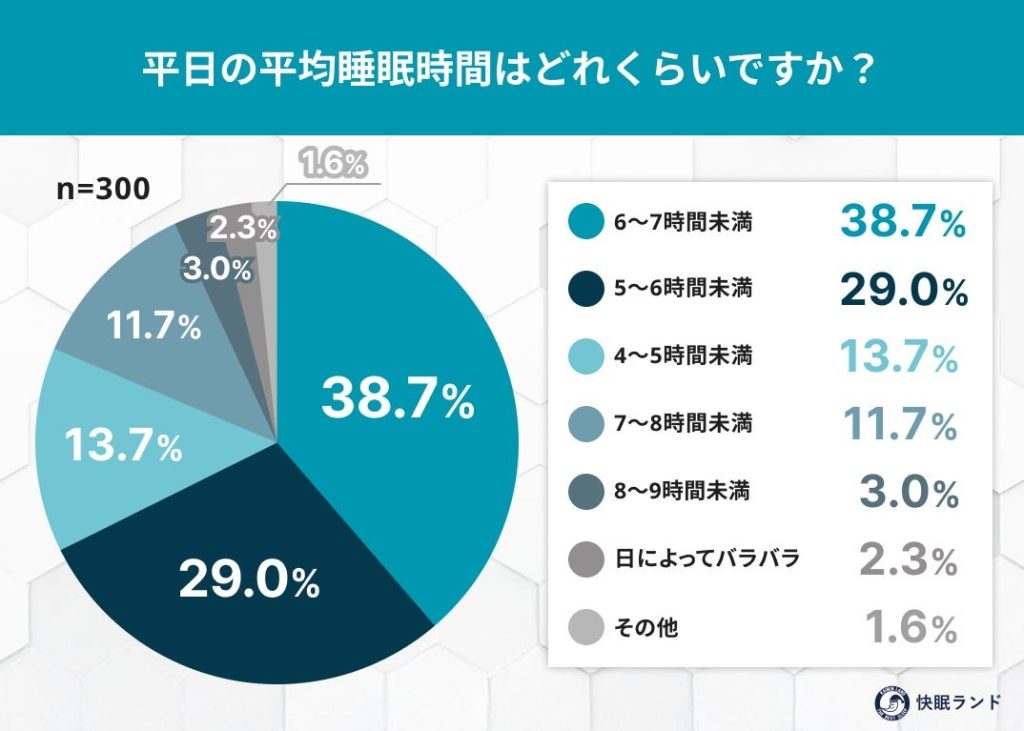 働く人の多くが「6〜7時間未満」もしくはそれ以下の睡眠にとどまっており、7割以上が「理想より短い睡眠」で生活している実態が浮き彫りとなった。