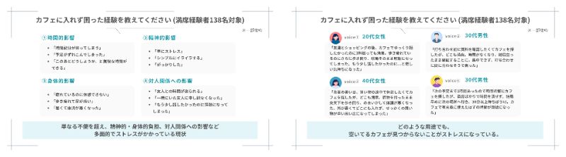 「カフェに入れなかった場合に困ったこと」を自由回答で聞いたところ、「単にストレスを感じた」「友人との時間が削られた」などの声が寄せられ、精神的・身体的負担や対人関係への影響といった深刻な課題が浮き彫りになった。
