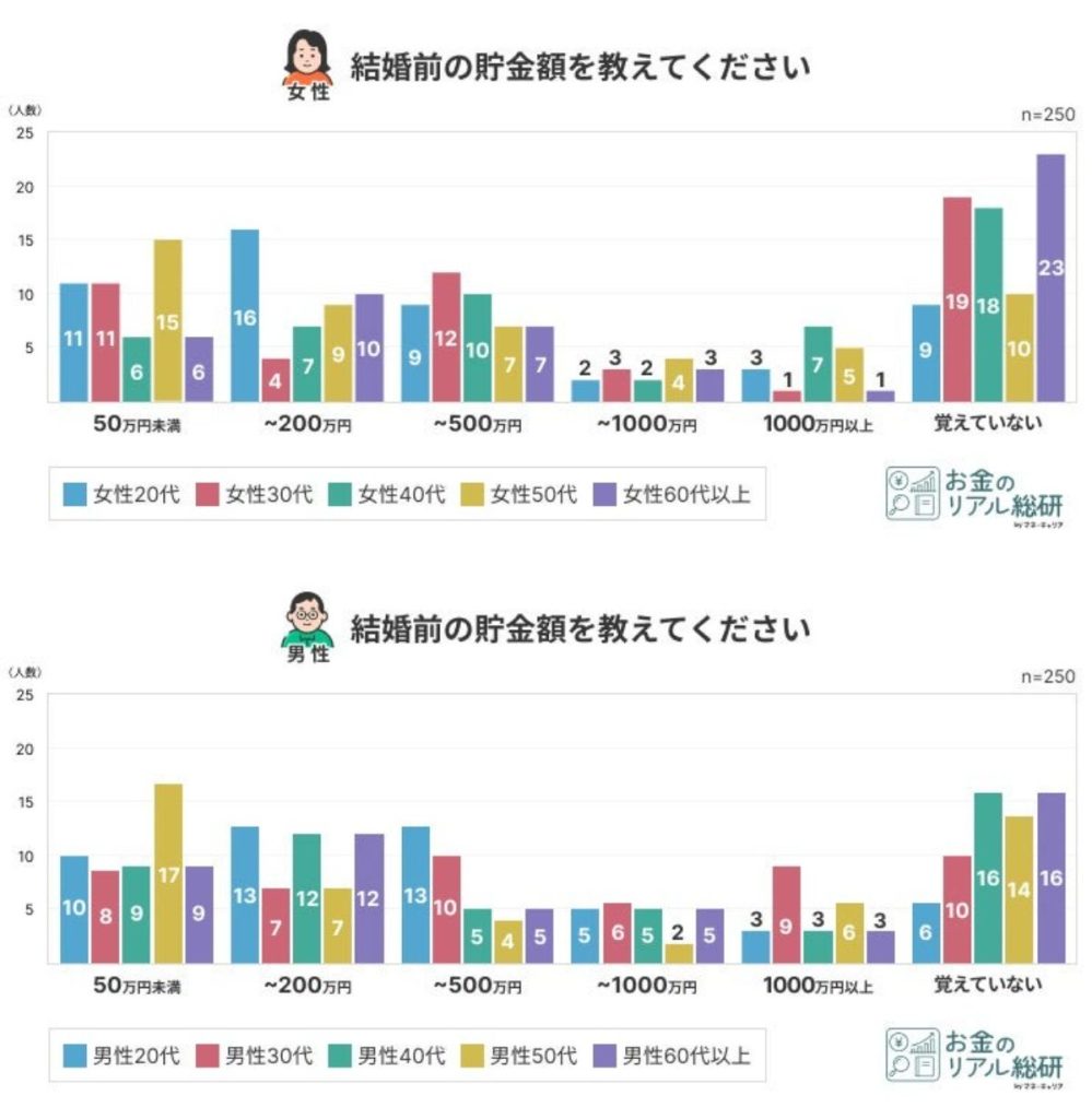 2.【結婚前の貯金額】結婚前の貯金、20代は控えめ・30代男性は1,000万円超・50代は二極化
