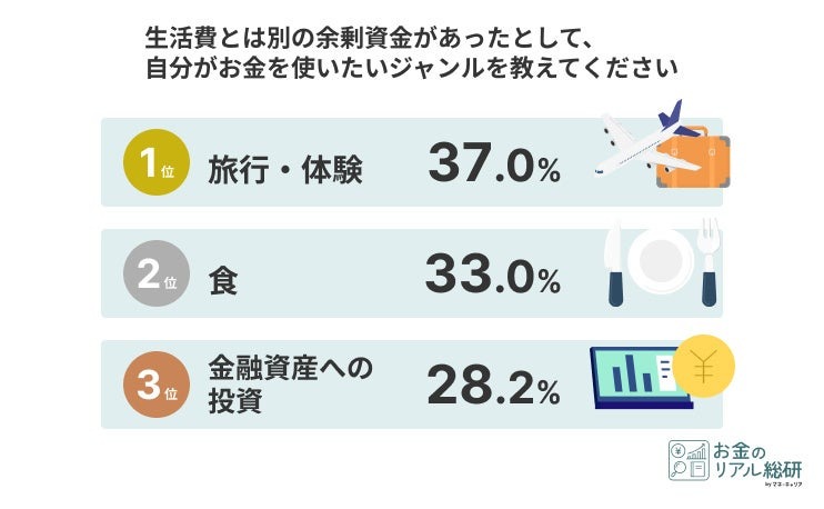 生活費以外に「自分がお金を使いたいジャンル」について尋ねたところ、男性は「金融資産への投資」が34.4%でトップとなり、ついで「旅行・体験」が33.2%となり、投資意識が高い結果に。
