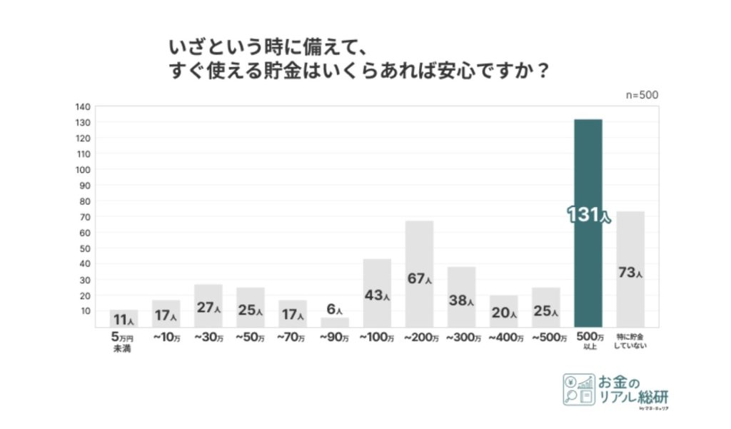「いざという時にすぐ使える預金」については、男女ともに「500万円以上」と回答した人が多く、堅実な備えを持つ傾向が見られた。