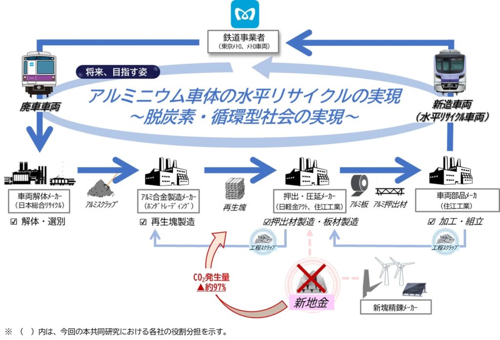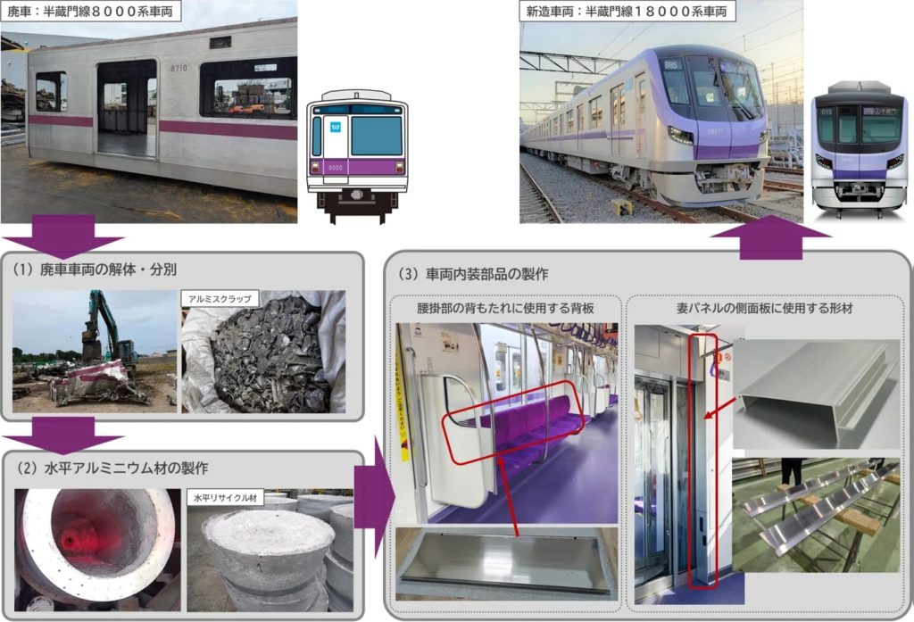 東京メトロ、メトロ車両、ホンダトレーディング、日本総合リサイクル、日軽金アクト、住江工業は共同で、半蔵門線8000系車両から18000系車両へのアルミニウム水平リサイクルを実現したと発表した。国内の地下鉄車両としては初めての取り組みであり、廃車車体を新造車両の内装部品へ循環利用することで、CO2排出量を約8トン削減できたという。