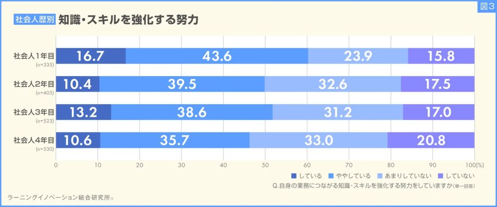 「自身の業務につながる知識・スキルを強化する努力をしているか」という質問に対し、「している」「ややしている」と答えた割合は、社会人1年目社員は60.3%の一方、社会人2年目社員は49.9%、社会人3年目社員は51.8%、社会人4年目社員は46.3%だった。
