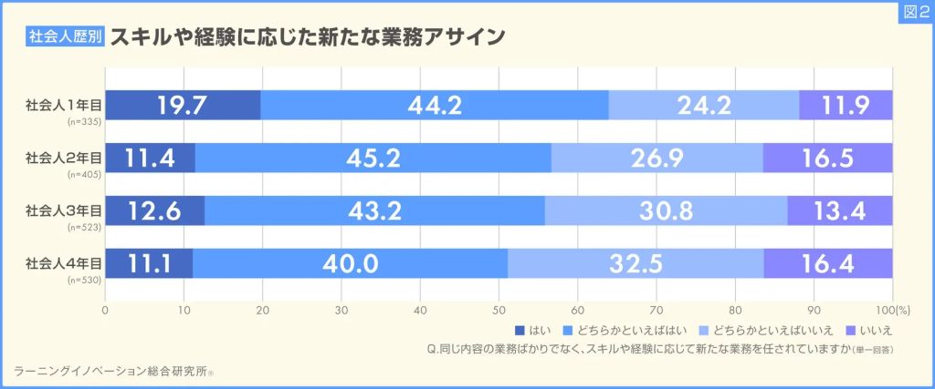 「同じ内容の業務ばかりでなく、スキルや経験に応じて新たな業務を任されているか」という質問に対し、「はい」「どちらかといえばはい」と回答した割合は、社会人1年目社員は63.9%、社会人2年目社員は56.6%、社会人3年目社員は55.8%、社会人4年目社員は51.1%だった。
