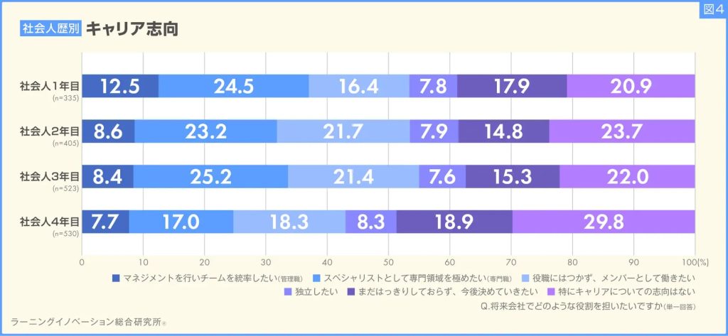 「まだはっきりしておらず、今後決めていきたい」「特にキャリアについての志向はない」の回答割合は、どちらも社会人4年目社員が最も高くなり、その合計は48.7%となっている。